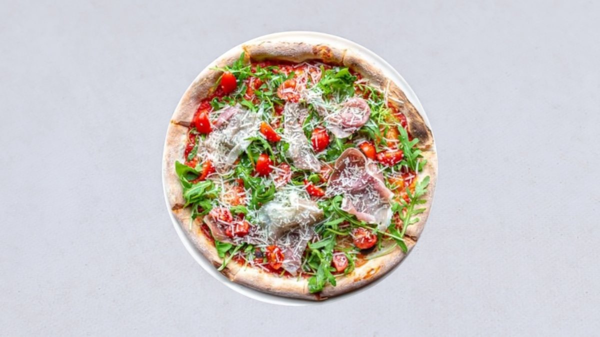 sos pomidorowy, mozzarella fior di latte, prosciutto crudo, pomidorki cherry, rukola, grana padano