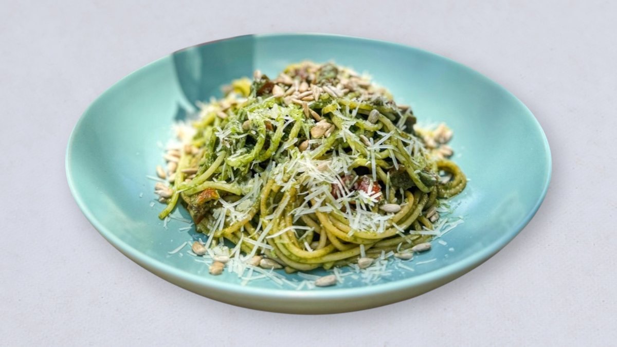 spaghetti, pesto bazyliowe, ziarna słonecznika, suszone pomidory, grana padano