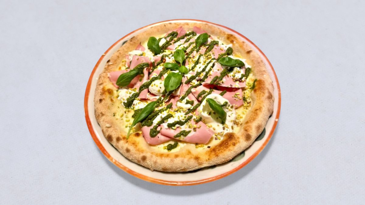 sos śmietanowy, mozzarella fior di latte, mortadela, burrata, pistacje, pesto bazyliowe