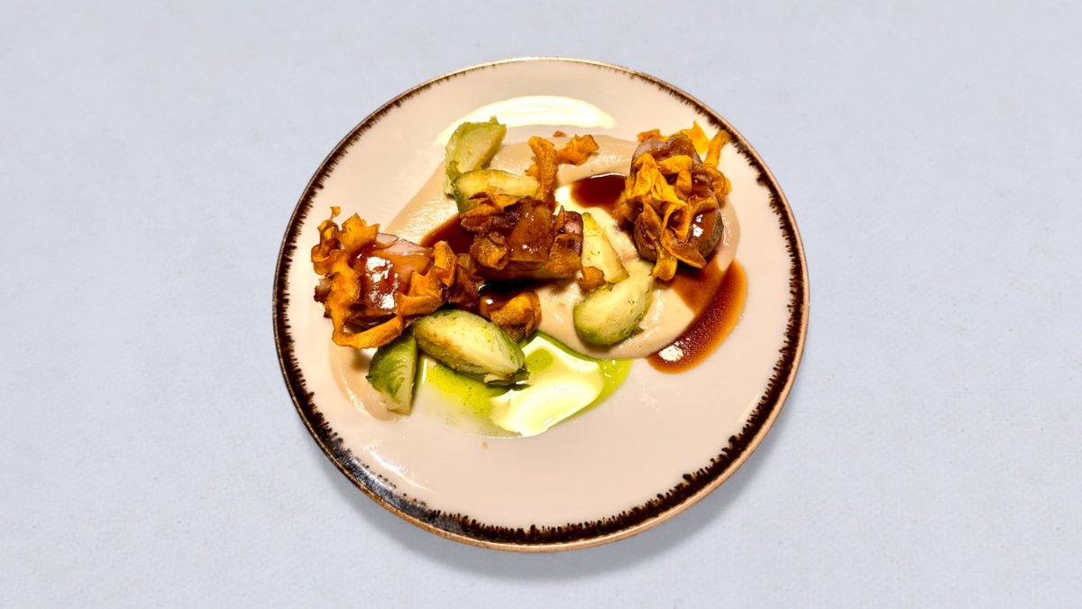 polędwiczka wieprzowa, puree z kalafiora, sos demi glace, brukselka, chips z marchewki, oliwa ziołowa