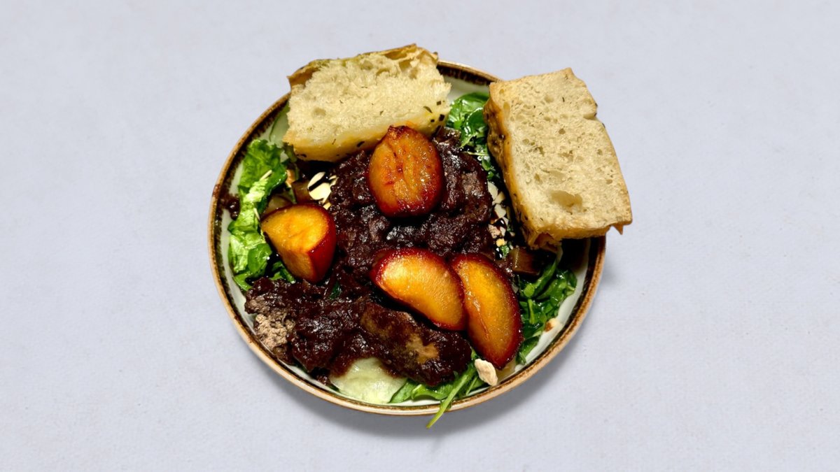 mix sałat, wątróbka, marynowane jabłko, karmelizowana śliwka, prażone migdały, ogórek, krem balsamiczny, ziołowy sos winegret, pieczywo