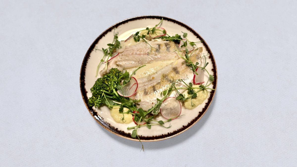 sandacz, komosa ryżowa, espuma z kalafiora i palonego masła, brokuł bimi, mus z pora, rzodkiewka, oliwa ziołowa