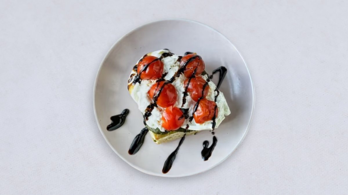 focaccia, pieczone pomidorki cherry, pesto bazyliowe, burrata, krem balsamiczny