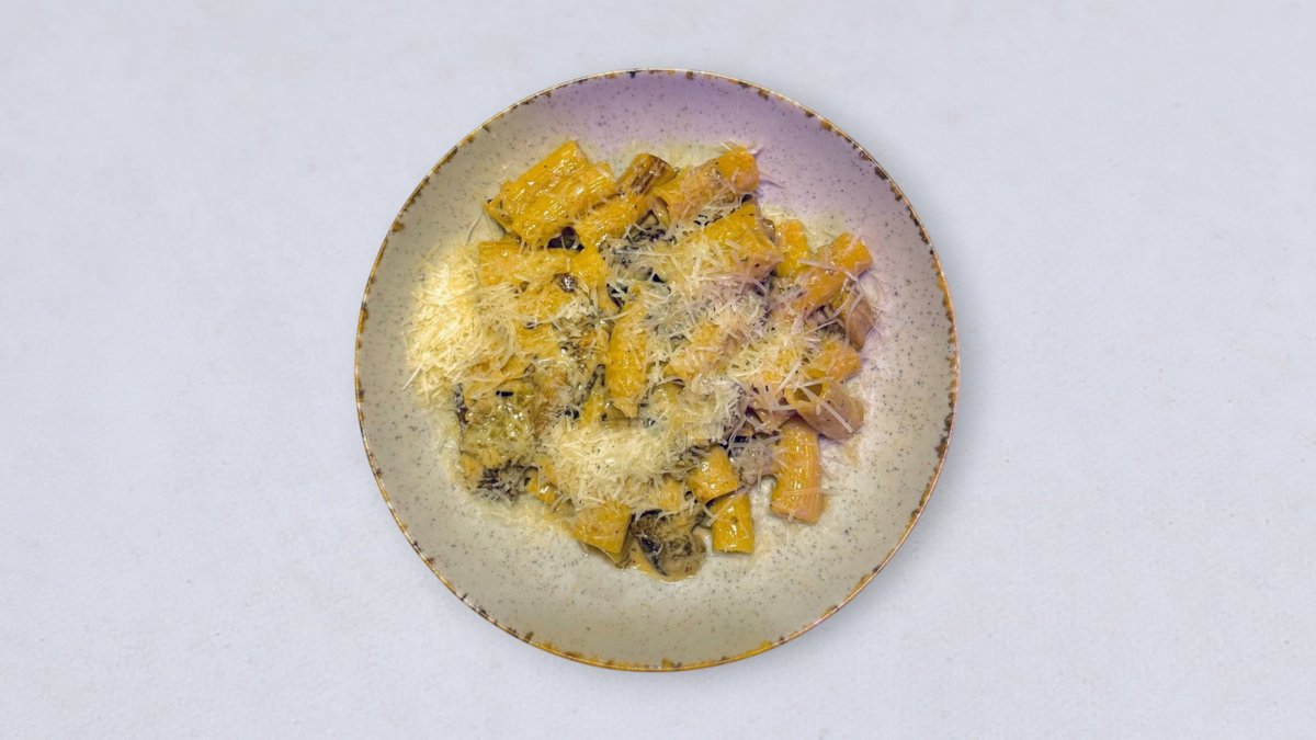 rigatoni, polędwiczka wieprzowa, podgrzybek, cebula, czosnek, śmietanka, tymianek, grana padano