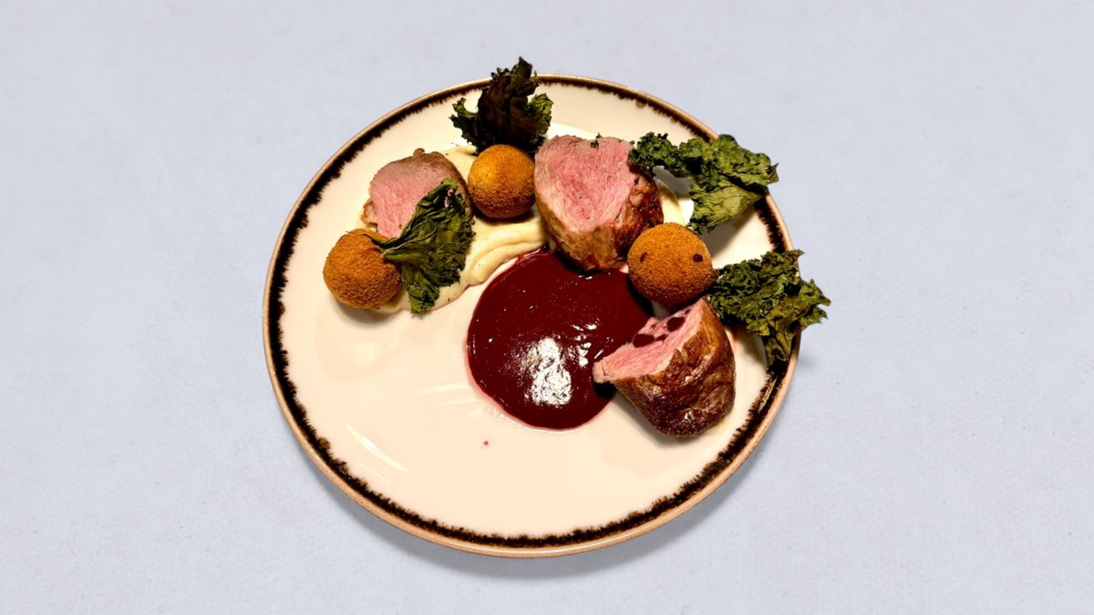 pierś z kaczki, puree z topinamburu, krokiet ziemniaczany, sos jeżynowy, chips z jarmużu, oliwa ziołowa