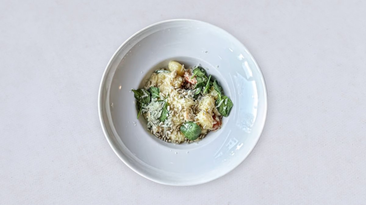 gnocchi, kurczak, pomidorki cherry, szpinak baby, gorgonzola, czosnek, grana padano, prażony słonecznik, śmietanka vege