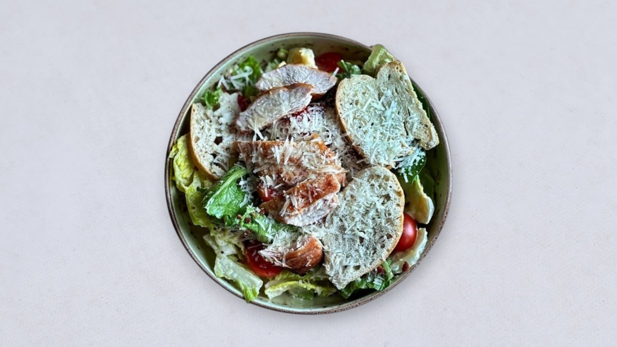 sałata rzymska, grillowana pierś z kurczaka, puder z boczku, chips z pieczywa, pomidorki daktylowe, sos cezar z anchois, grana padano