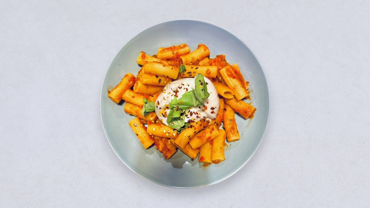 rigatoni, sos pomidorowy, burrata, bazylia