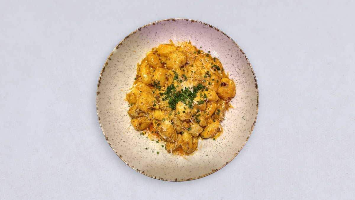 gnocchi, polędwiczka wieprzowa, nduja, czerwona cebula, czosnek, śmietanka, szczypiorek, grana padano