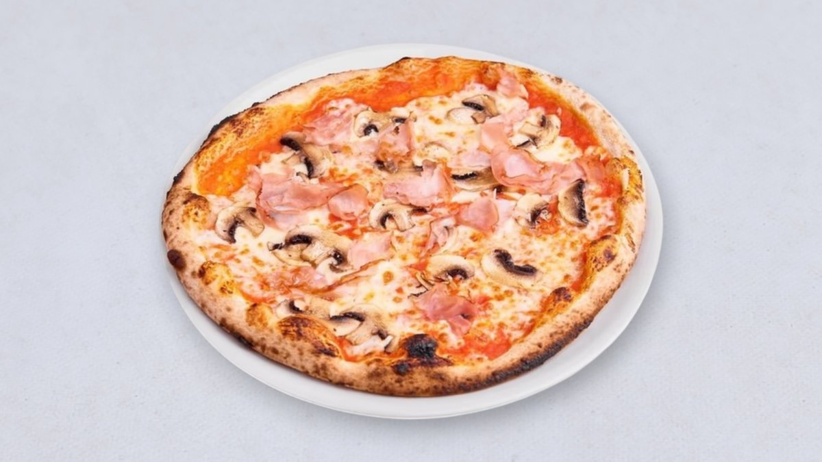 sos pomidorowy, mozzarella fior di latte, prosciutto cotto, pieczarki