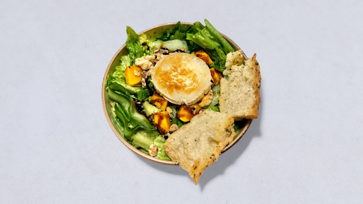 sałata rzymska, kozi ser, ogórek, pieczona dynia, orzechy włoskie, sos musztardowy, krem balsamiczny, pieczywo