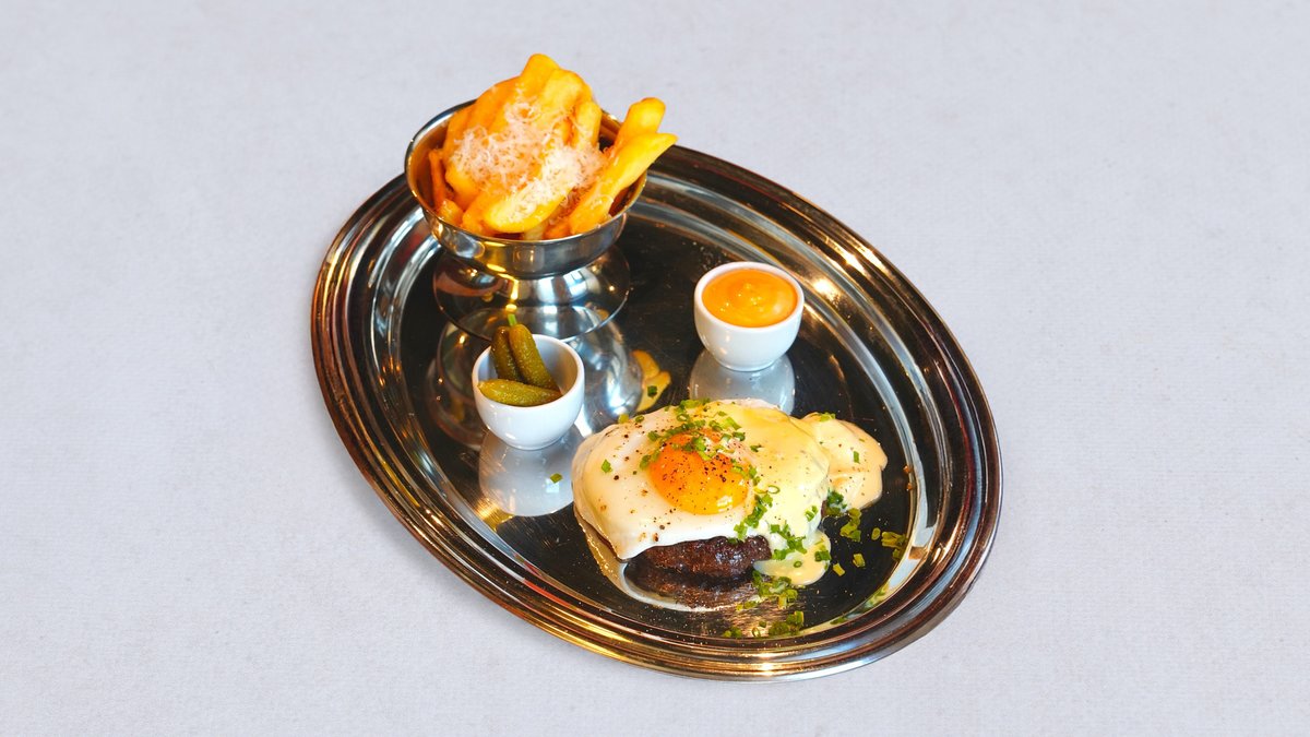 Soczysty kotlet wołowy z jajkiem sadzonym i szczypiorkiem, frytki z parmezanem, sos Between i pikle