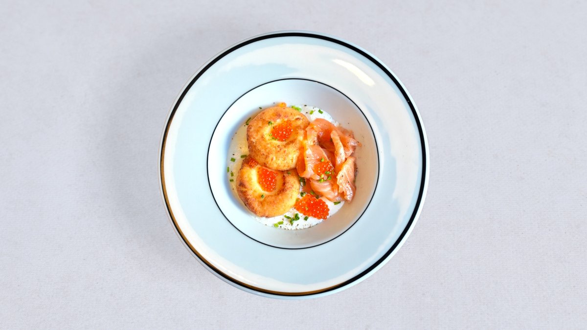 Delikatne placki twarogowe z łososiem gravlax, sosem chrzanowym, kawiorem z łososia i szczypiorkiem