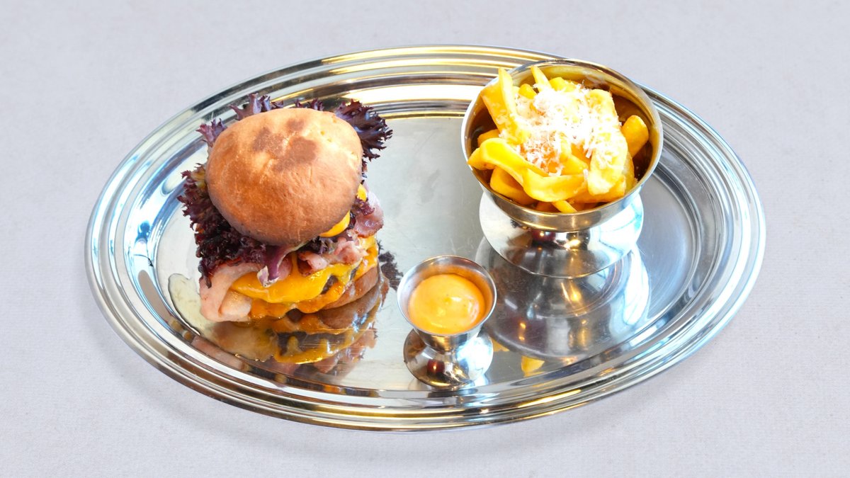 Bułka brioche z wołowym kotletem, sosem Between, marmoladą z cebuli, cheddarem, sałatą i frytkami z parmezanem