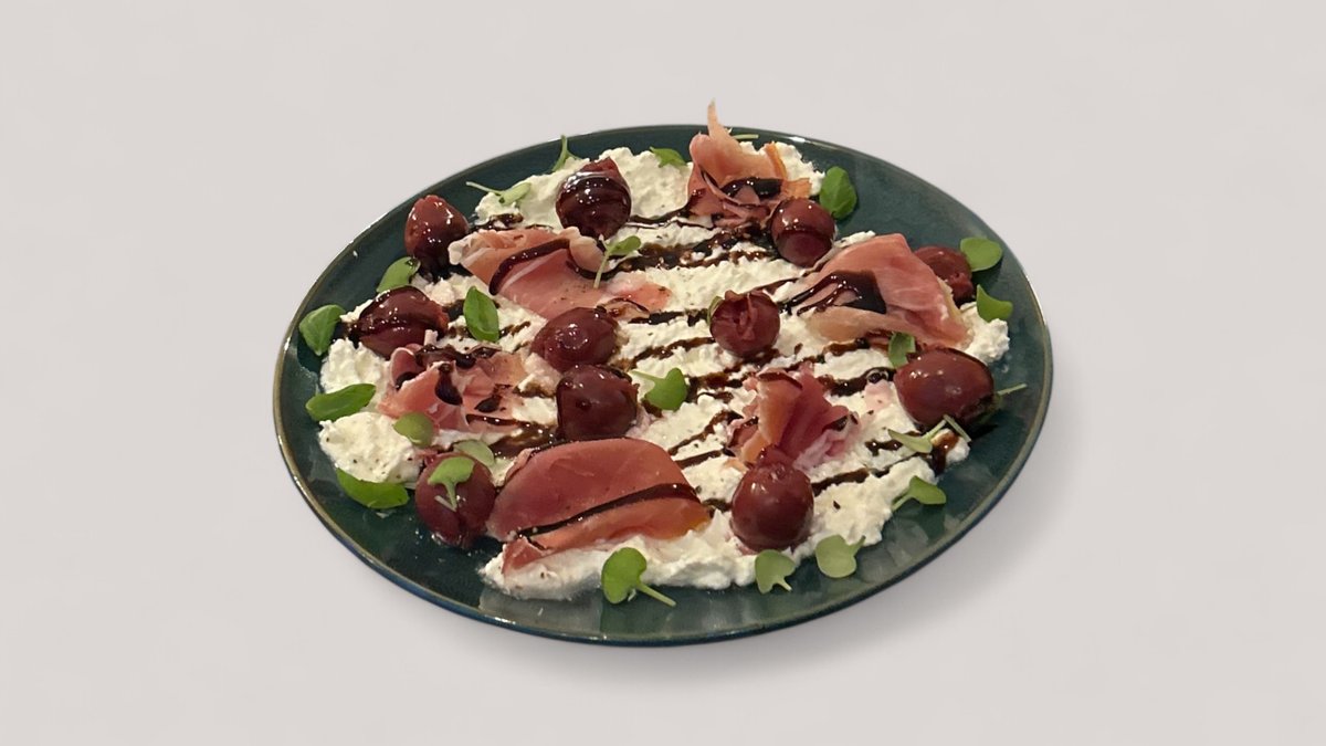 Burratą, wiśnia konserwowana, prosciutto. Sos balsamiczny.