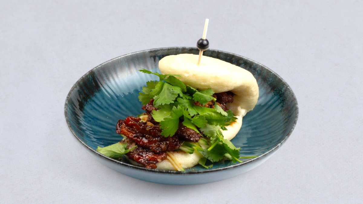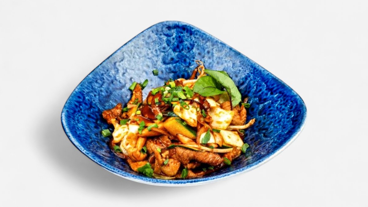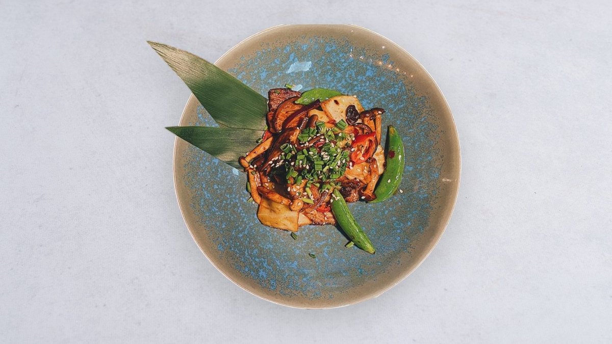 Cienkie smażone plastry rostbefu z makaronem udon, grzybami shiitake, mun, fasolką edamame oraz warzywami w lekko pikantnym, szanghajskim sosie XO - sos na bazie suszonych owoców morza, dojrzewającej wieprzowiny, czosnku i czarnej fasoli soi