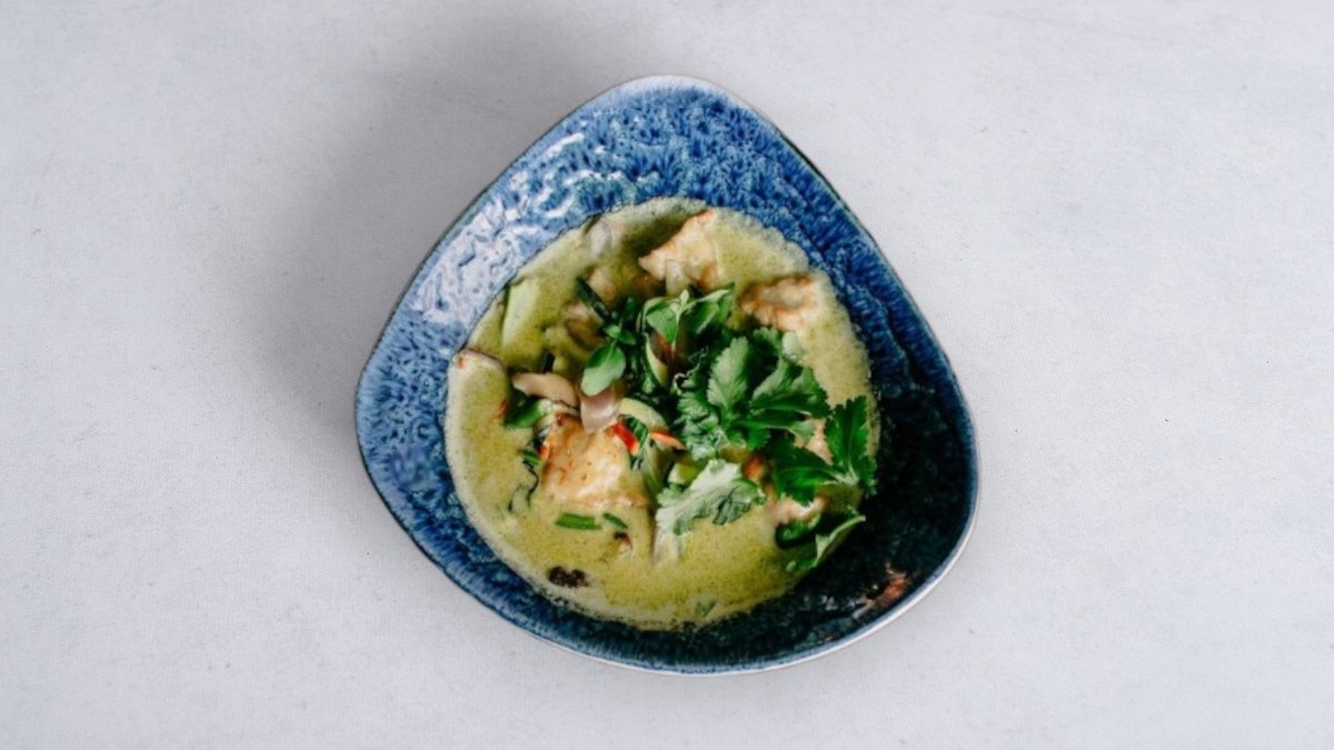 Kurczak/tofu/krewetki z warzywami w sosie z zielonej pasty curry oraz mleka kokosowego, orzechami ziemnymi i ryżem jaśminowym. Posypane kolendrą i tajską bazylią.
