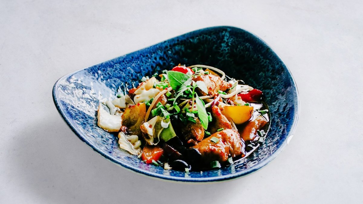 Smażone kawałki bakłażana i tofu w aromatycznym ostro-kwaśnym sosie sosie z czosnkiem, imibirem, kolendrą i orzechami, podawane z ryżem jaśminowym