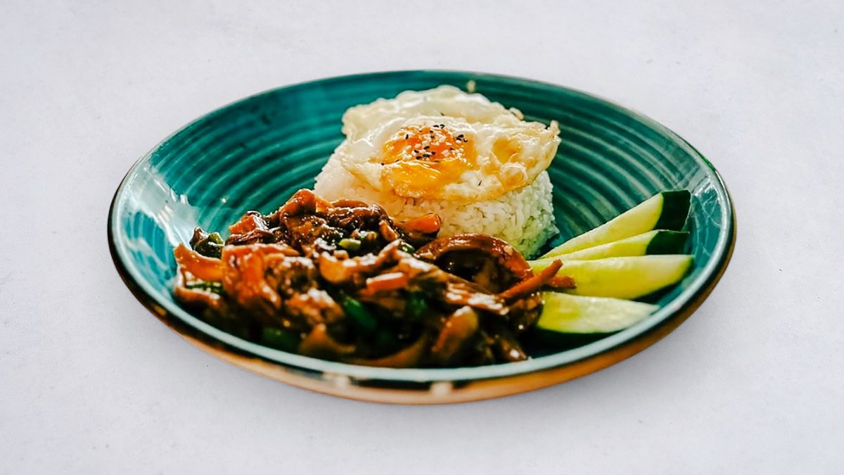 Wołowina z tajska bazylią w aromatycznym słono- pikantnym sosie. Podawane z ryżem jaśminowym i jajkiem