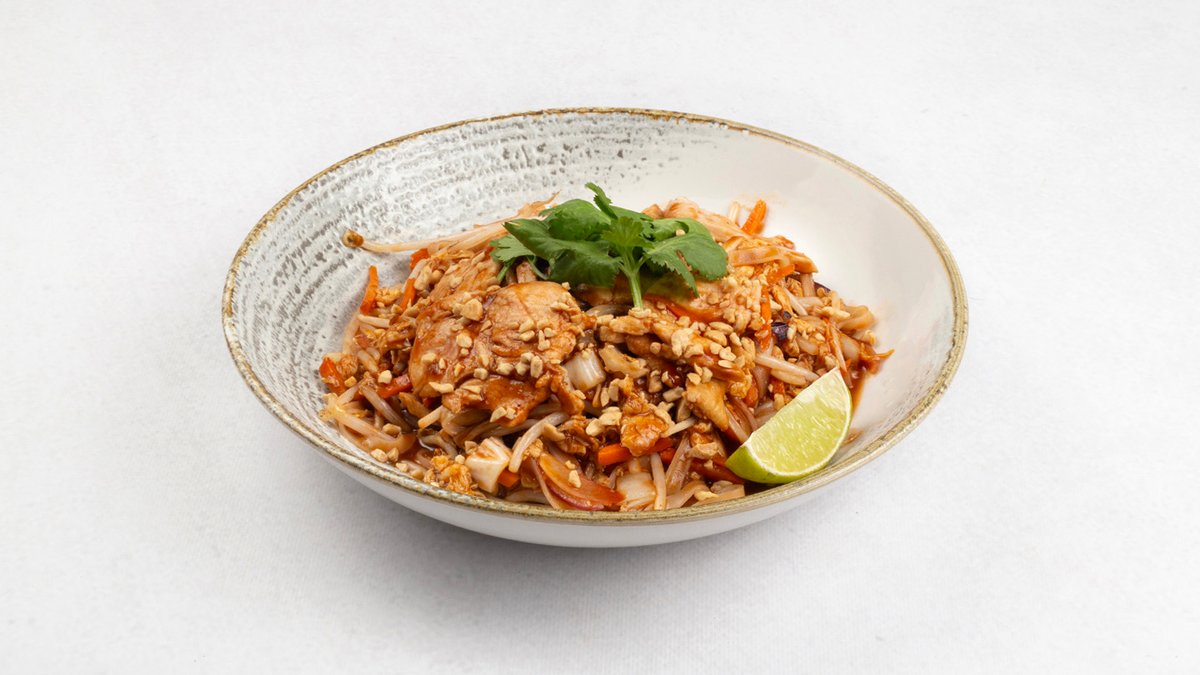 Tajska klasyka, smażony makaron ryżowy z kiełkami, cebulą, bambusem orzechami i kolendrą z sosem na bazie tamaryndowca
