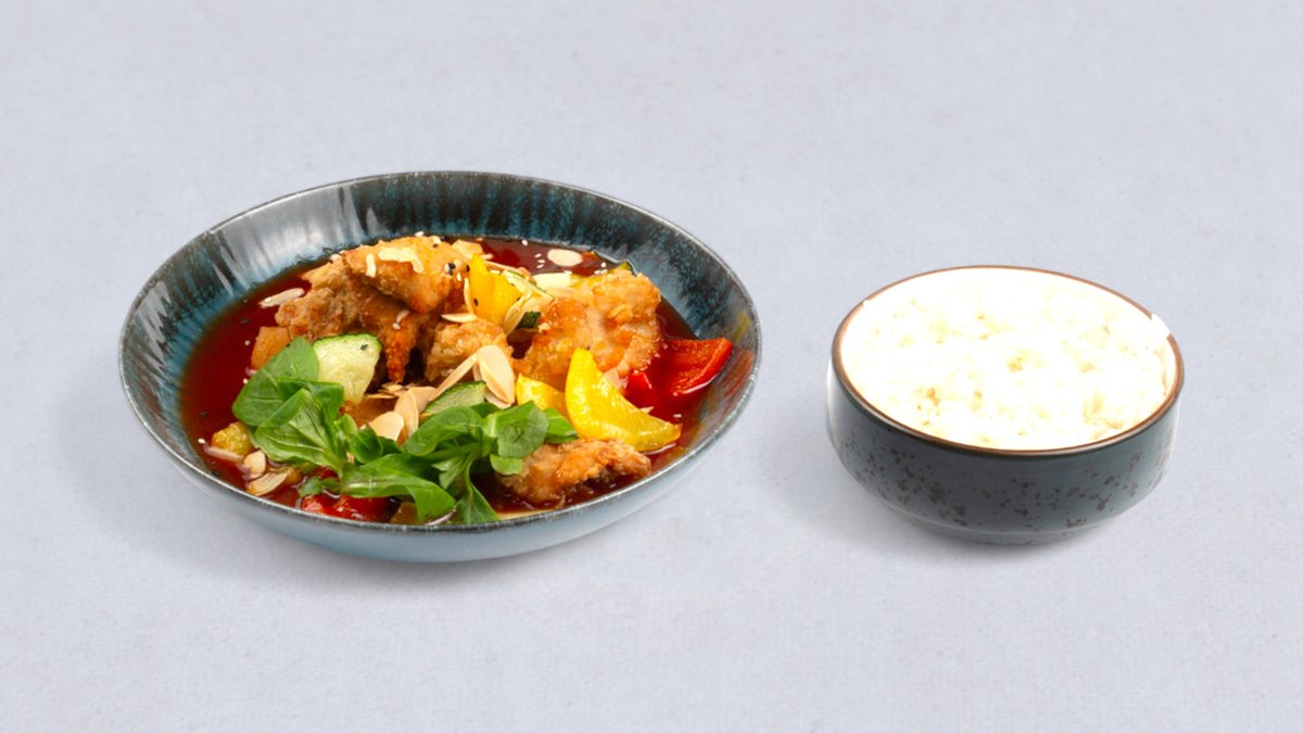 Soczyste kawałki kurczaka w chrupiącej panierce z warzywami, ananasem i migdałami w słodko kwaśnym sosie. Podane z ryżem jaśminowym