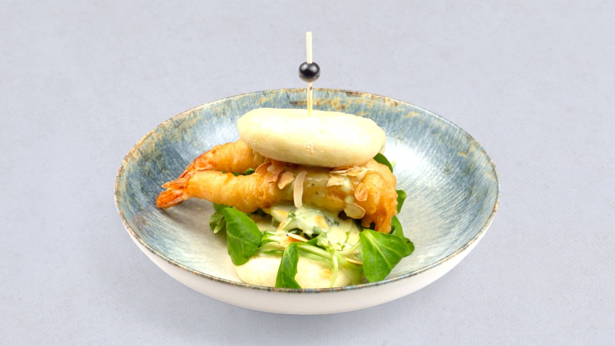 Dwie krewetki w tempurze, sos wasabi mayo, Awokado, canpyo, migdały.