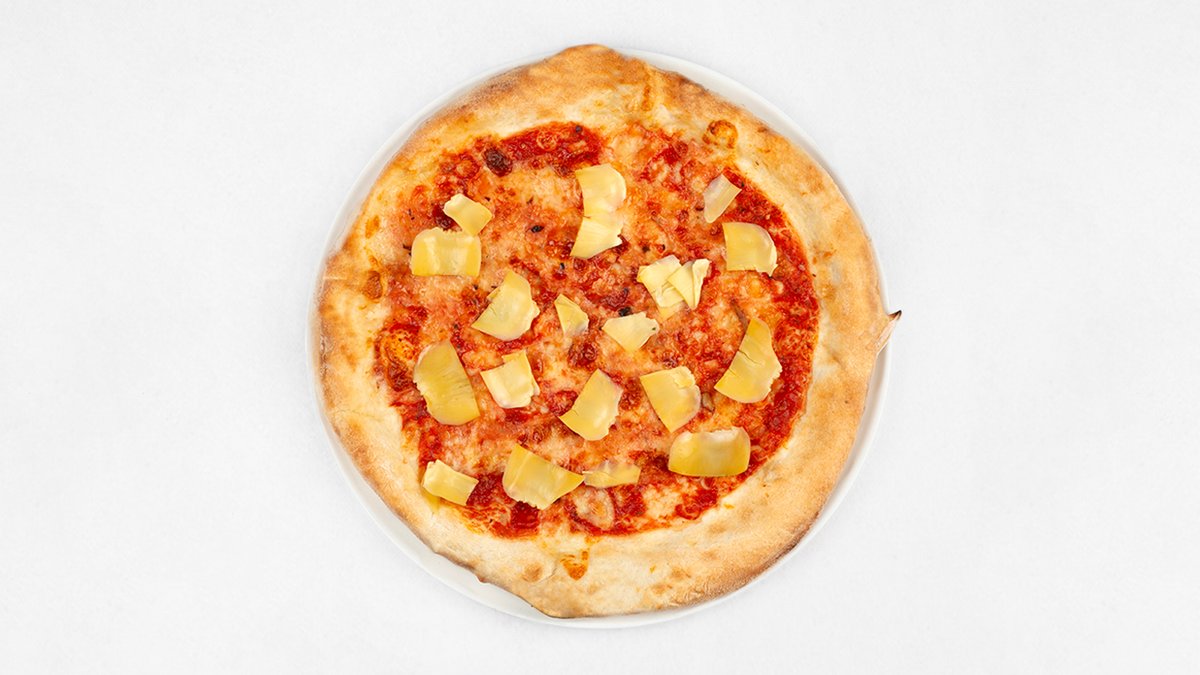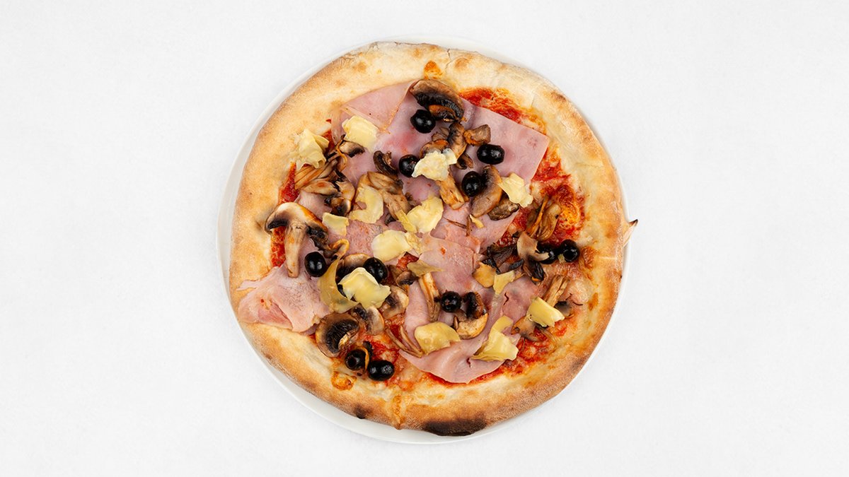 Sos z pomidorów San Marzano D.O.P, mozzarella fior di latte, szynka, pieczarki, oliwki, karczochy
