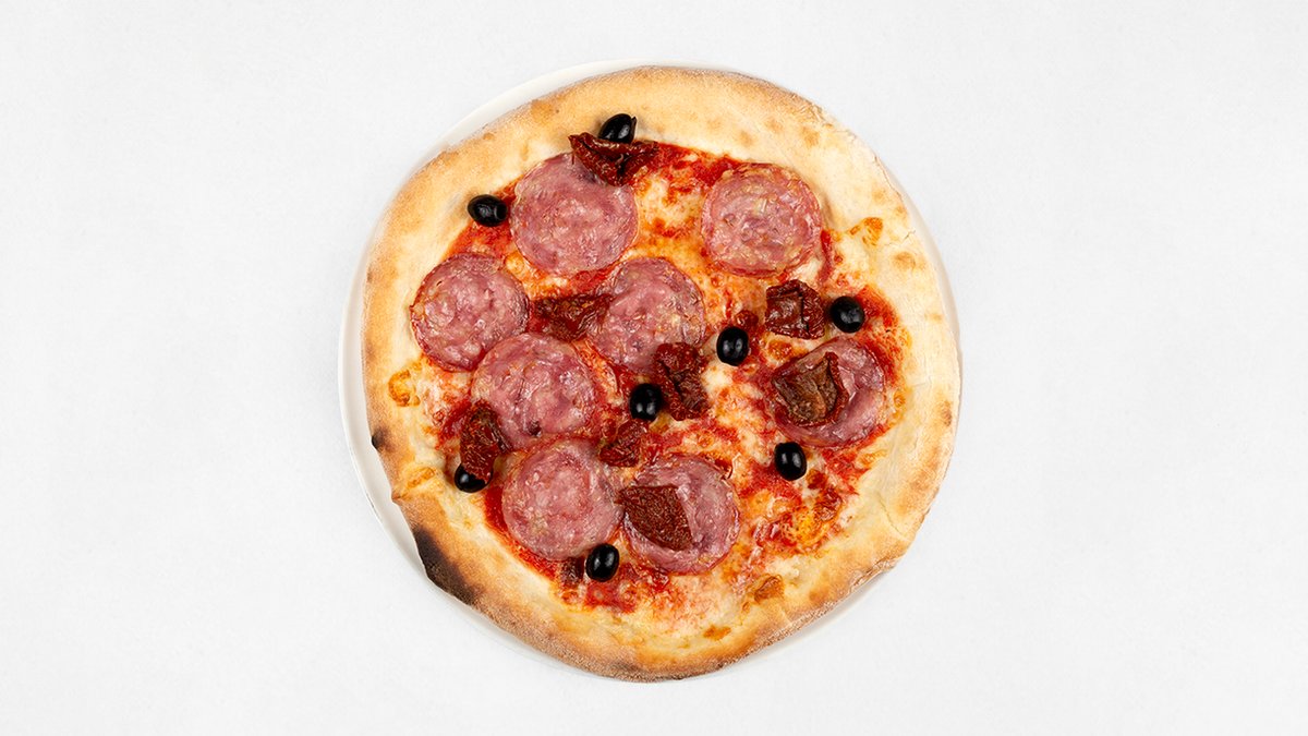 Sos z pomidorów San Marzano D.O.P, mozzarella fior di latte, salami, oliwki, suszone pomidory