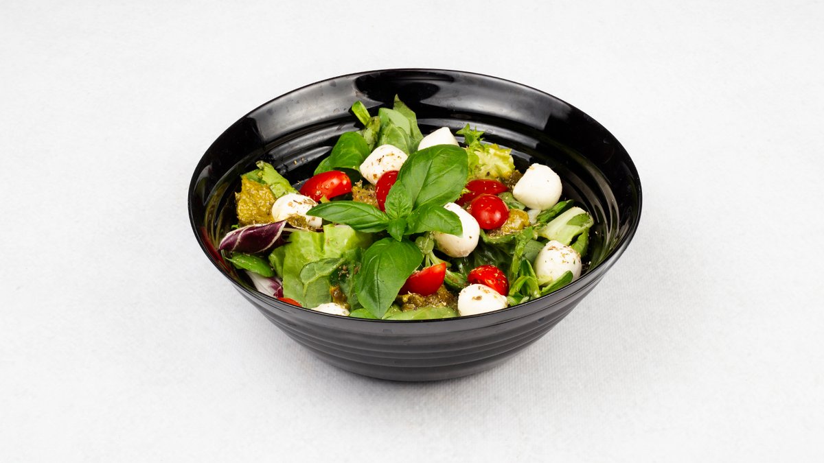 Miks sałat, pomidorki koktajlowe, mini mozzarella, sos pesto bazyliowy