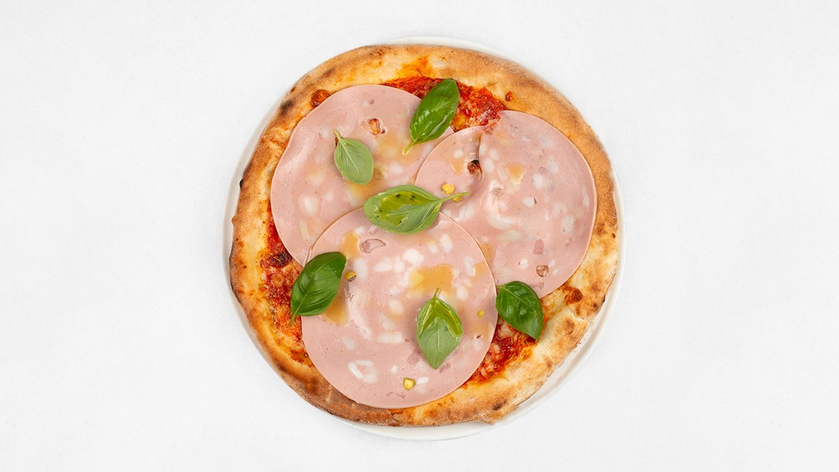 Sos z pomidorów San Marzano D.O.P, mozzarella fior di latte, włoska mortadella z pistacjami