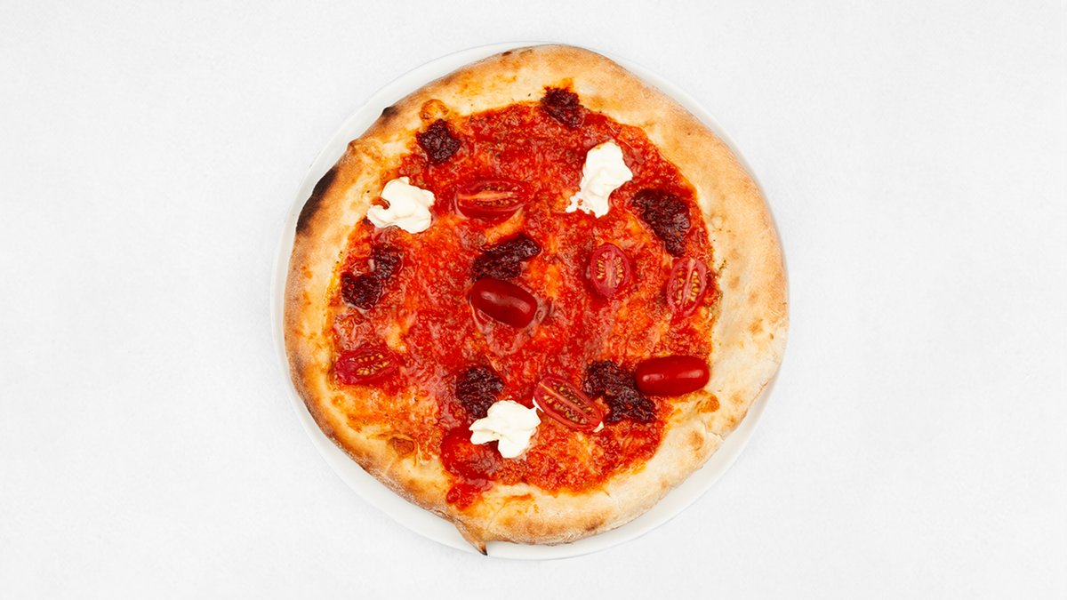 Sos z pomidorów San Marzano D.O.P, mascarpone, mozzarella fior di latte ostra kiełbasa n'duja, pomidorki koktajlowe