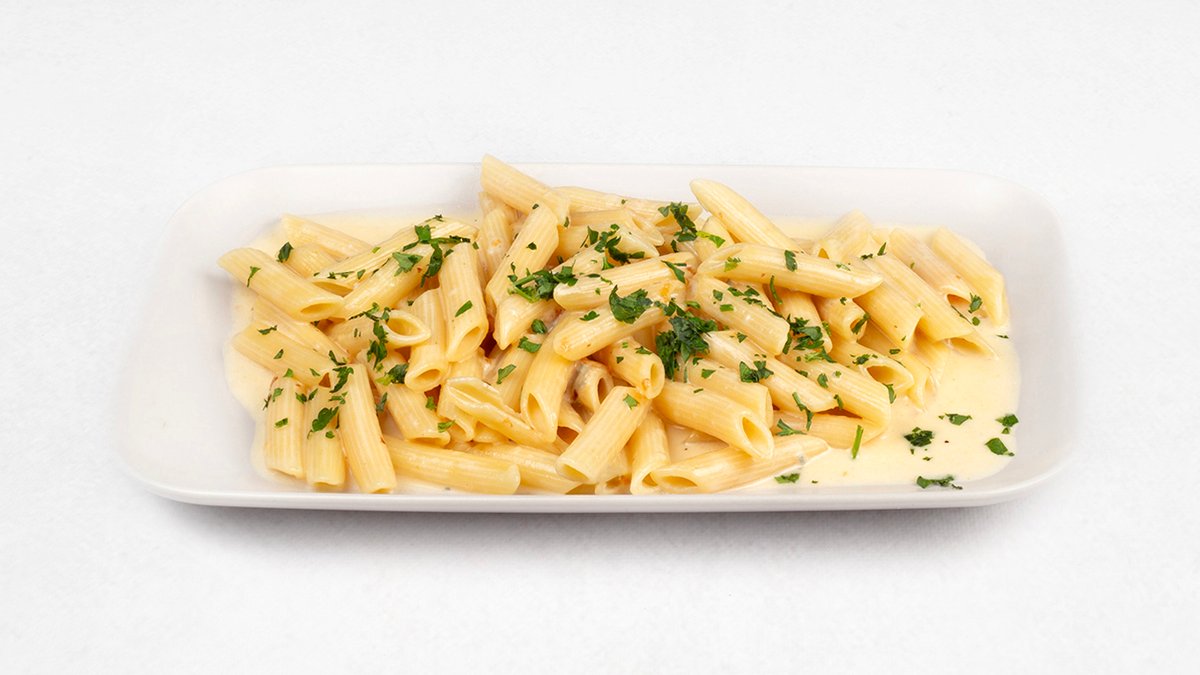 Makaron penne z sosem serowym: mozzarella fior di latte, parmezan, provola, gorgonzola, śmietanka