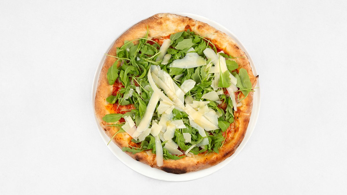 Sos z pomidorów San Marzano D.O.P, mozzarella fior di latte, rukola, płatki parmezanu