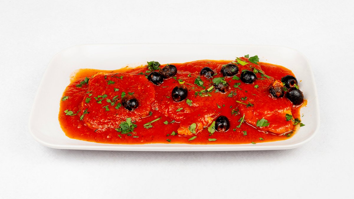 Schab z sosem pomidorowym, oliwkami, czosnkiem i oregano