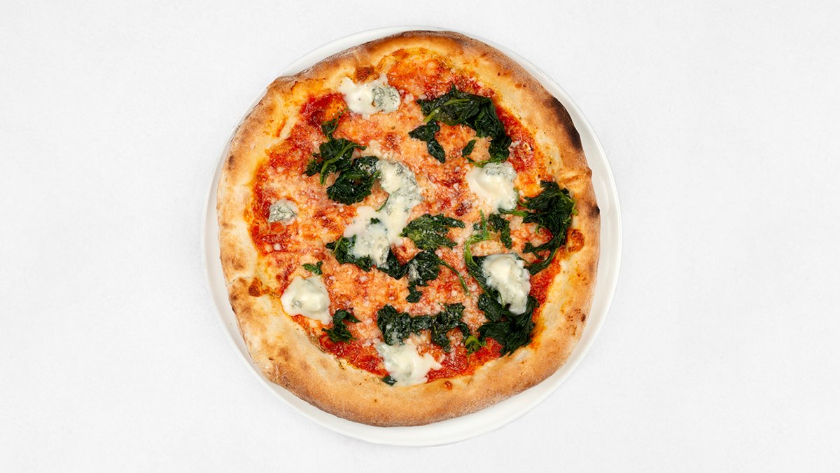 Sos z pomidorów San Marzano D.O.P, mozzarella fior di latte, szpinak, gorgonzola d.O.C,