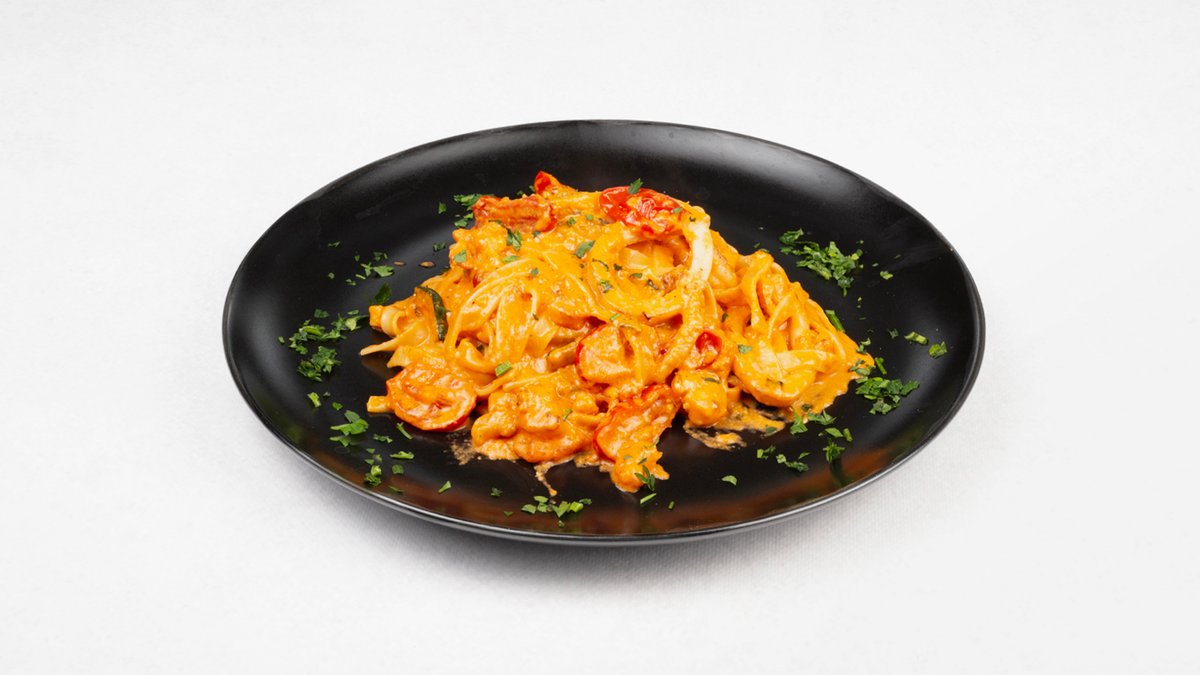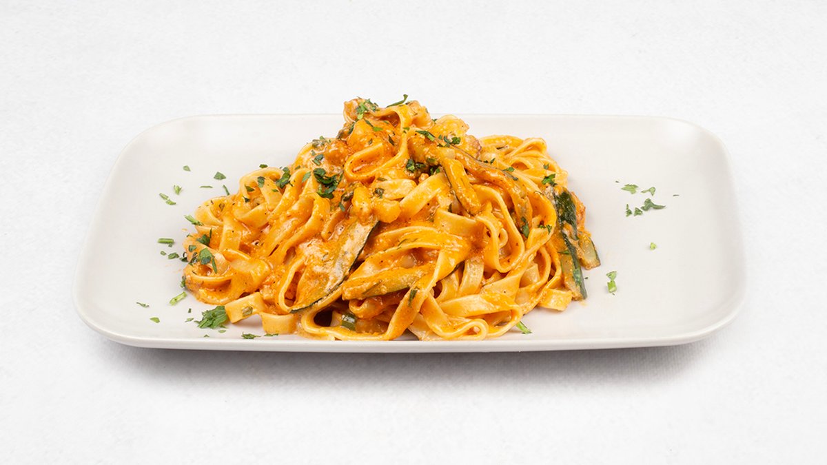 Makaron tagliatelle z cukinią, krewetkami, śmietaną, sosem z pomidorów San Marzano D.O.P, czosnkiem i pietruszką