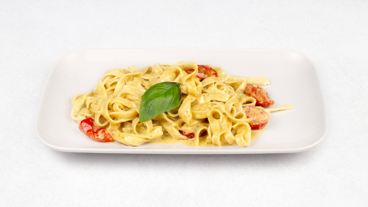 Makaron tagliatelle z pesto z bazylii i orzeszków piniowych, z pomidorkami koktajlowymi, parmezanem i śmietaną
