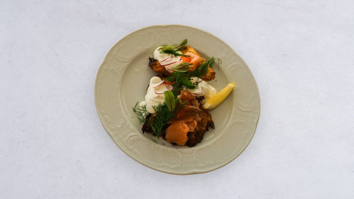 Domowe placki ziemniaczane, wędzony łosoś, czerwony kawior, kwaśna śmietana, koper