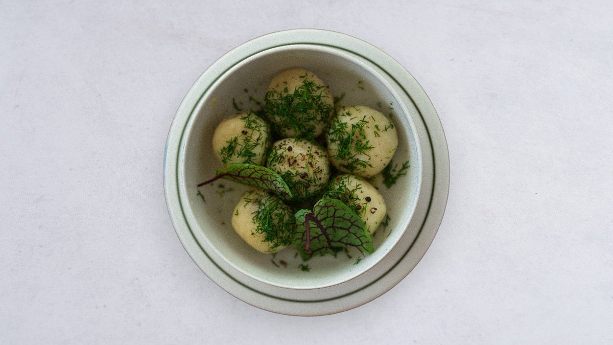 Ręcznie robione pyzy nadziewane duszoną wieprzowiną, palone masło z koperkiem