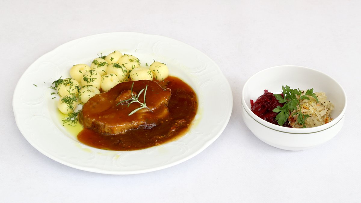 Karkówka wieprzowa z pieca w sosie własnym, domowe kopytka / ziemniaki z koperkiem, surówka