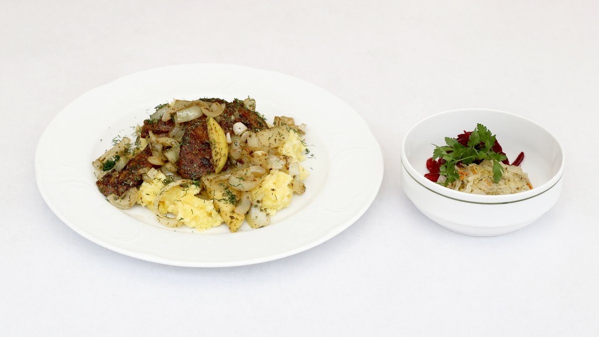 Kurze wątróbki smażone z cebulką i świeżym jabłkiem, ziemniaki z koperkiem, surówka