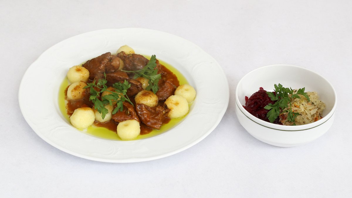 Gulasz z marynowanego w ziołach dzika duszonego w czerwonym winie z wędzoną śliwką i grzybami, kopytka, surówka