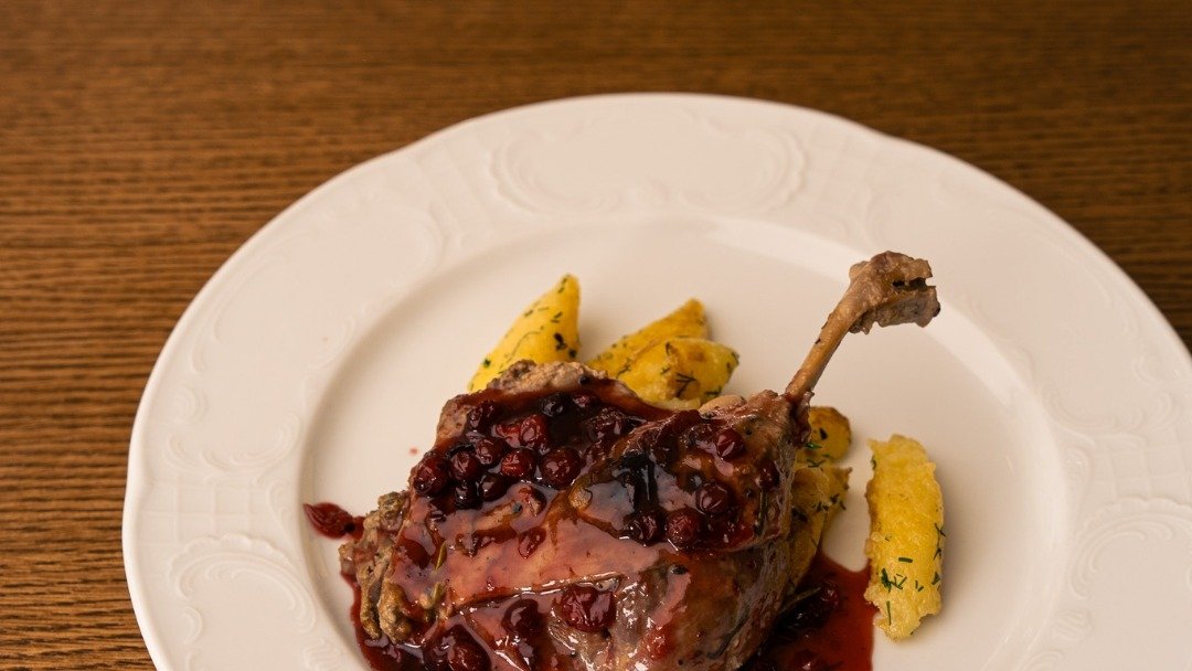 Udko z kaczki w sosie żurawinowym ,podsmazane kopytka z koperkiem, surowka