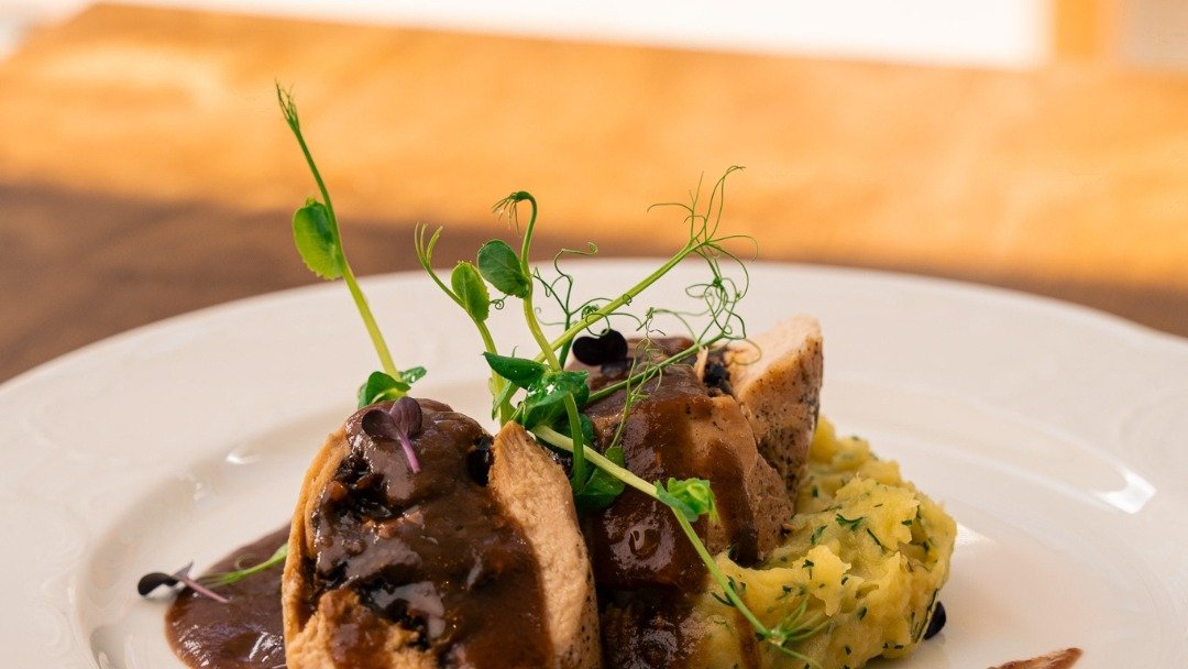 Filet drobiowy nadziewany serem feta z szuszoną śliwką w sosie ze sliwek i wina