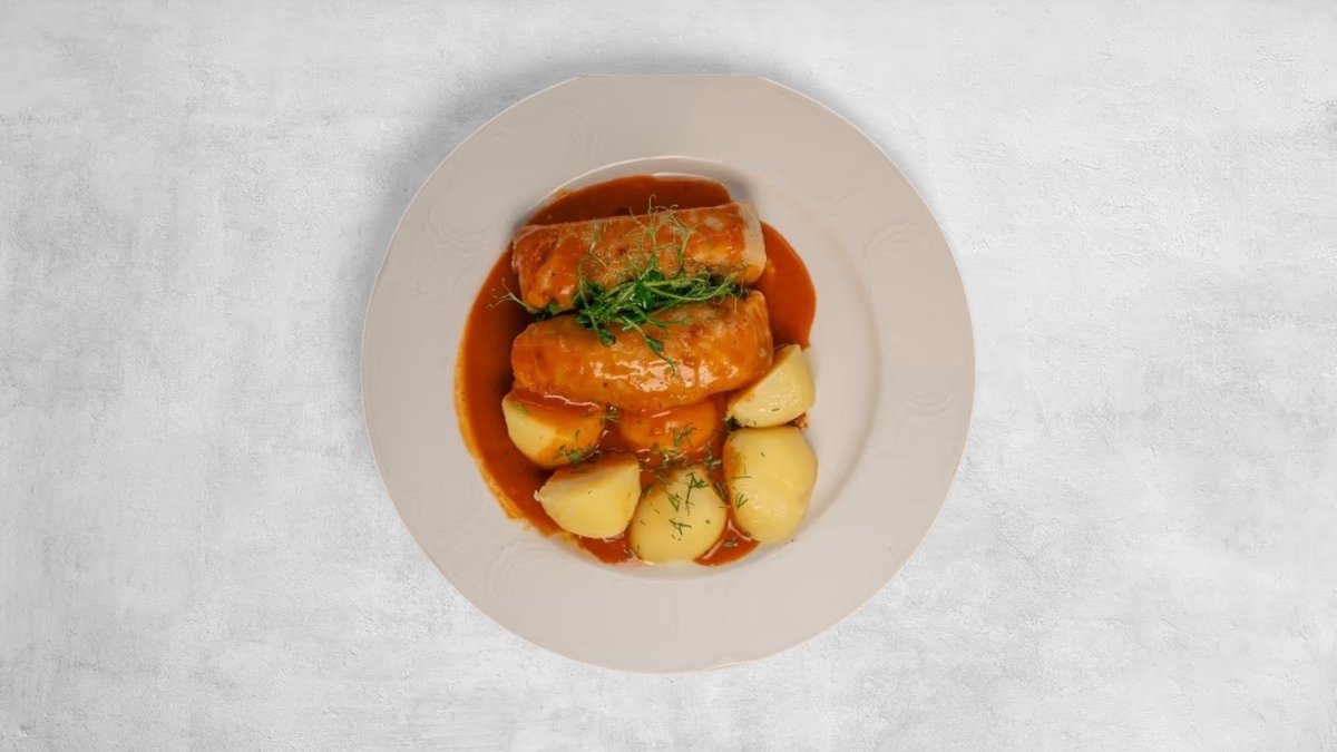 Liście z białej kapusty faszerowane mięsem wieprzowym i ryżem, sos pomidorowy, ziemniaki z koperkiem.