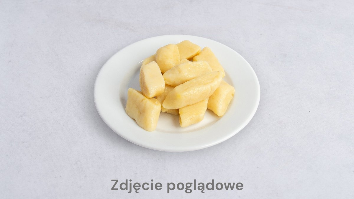 Domowe pierogi ruskie, okrasa z cebuli, szczypior, kwaśna śmietana