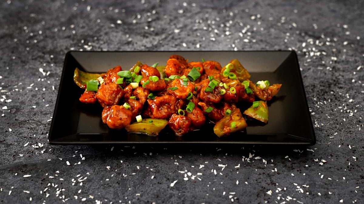 Odrobina indyjsko-chińskiego smaku. Talerz chrupiącej piersi z kurczaka z nutką czosnku, imbiru, soi oraz pikantnej papryki