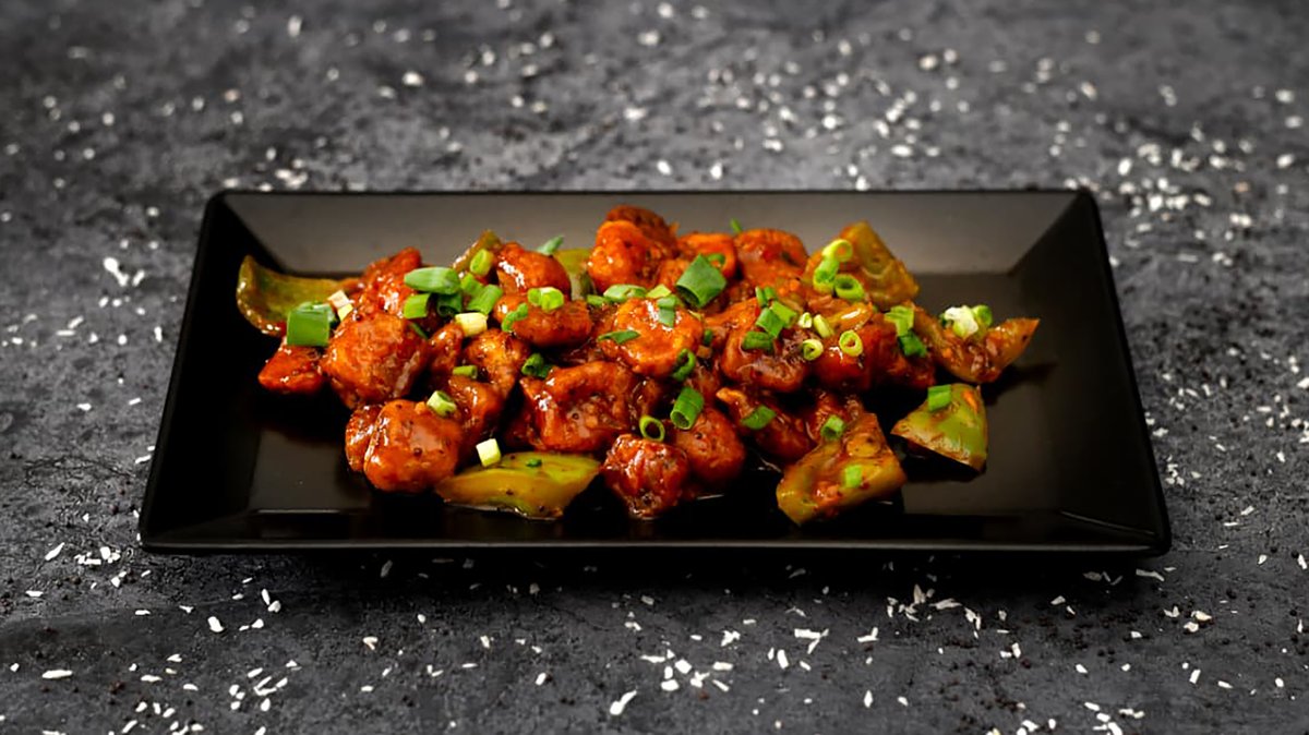 Indyjski biały ser zamarynowany w świeżo zmielonych przyprawach, smażony z papryką w sosie sojowo-chilli