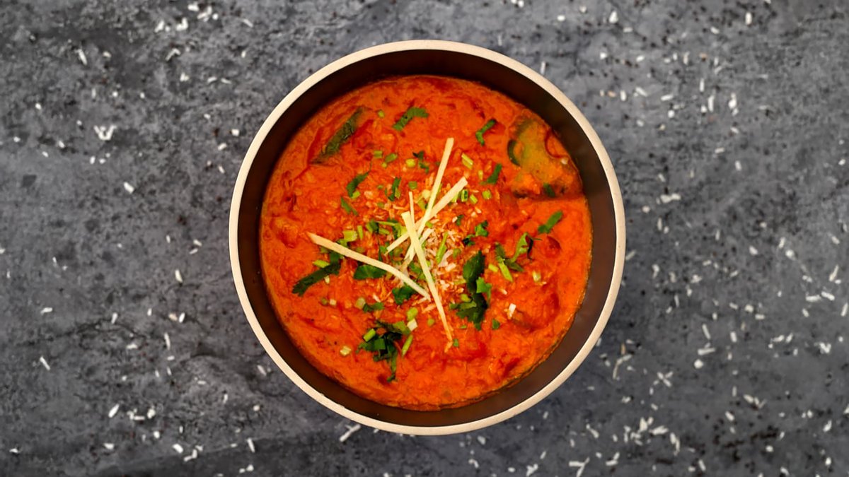Kurczak tandoor, gotowany z karmelizowanymi pomidorami oraz kozieradką, pikantny i intensywny w smaku