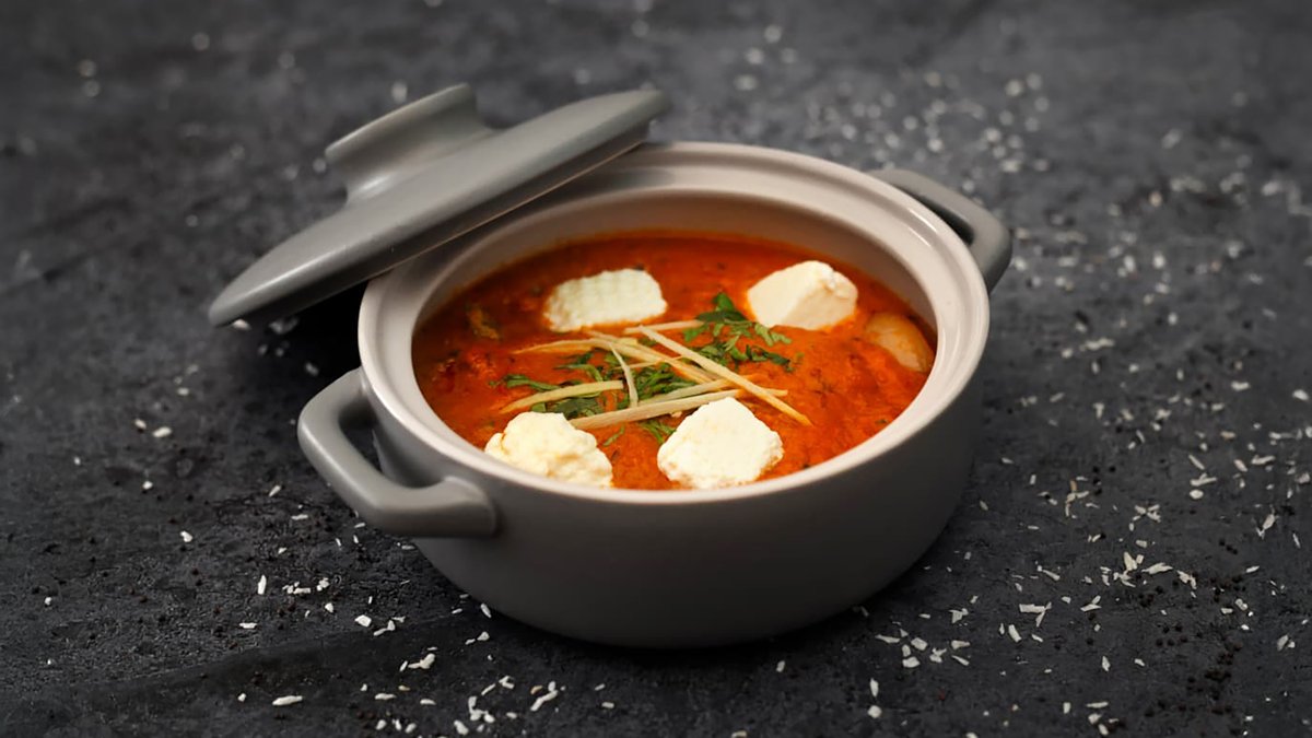 Delikatne kostki sera paneer zanurzone w aromatycznym sosie na bazie cebuli, świeżej kolendry i pomidorów oraz nutą liści kozieradki. Zdjęcie poglądowe